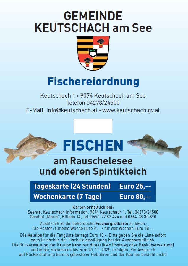 Fischerkarten, sind im Tourismusbüro Keutschach erhältlich. Zusätzlich ist die behördliche Fischergastkarte zu lösen.