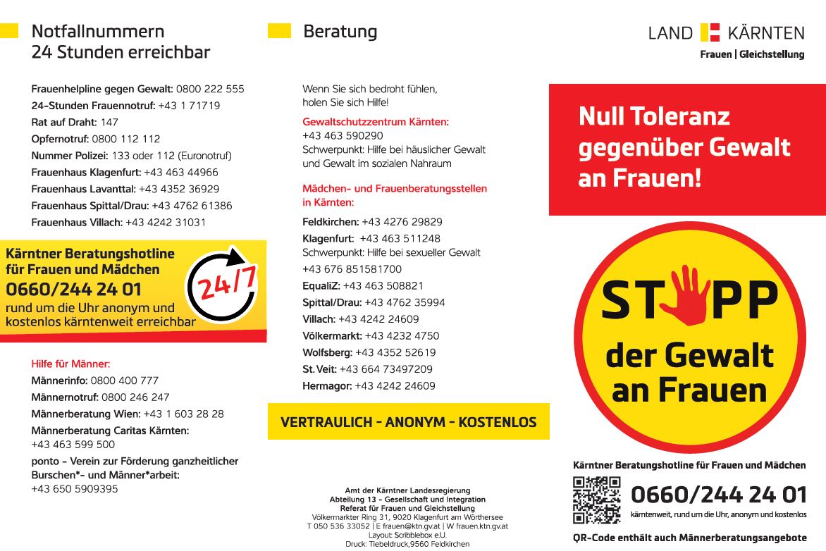 Alle Unterstützungsangebote im Überblick finden Sie unter: https://frauen.ktn.gv.at/service/gewaltschutz