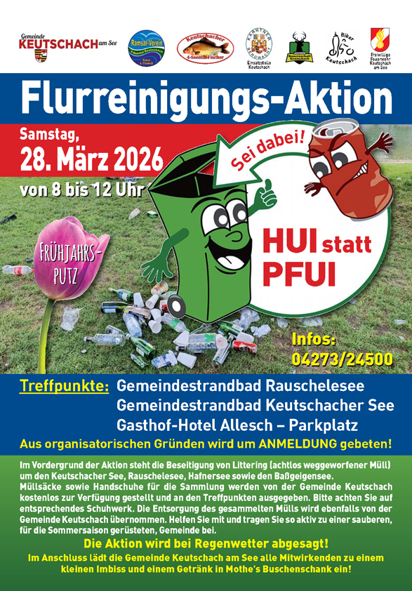 Starten wir sauber in den Frühling! Um unsere Gemeinde sauber zu halten, laden wir alle Gemeindebürger und Gemeindebürgerinnen, Vereine und Institutionen herzlich zur Flurreinigung am Samstag, den 28. März 2026 ein.