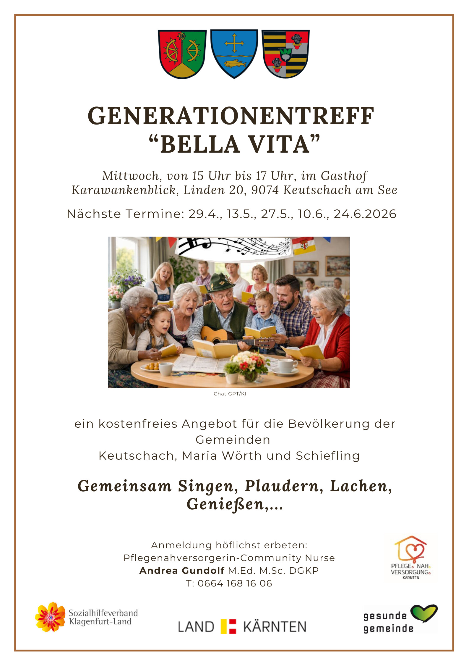Am 29.4., 13.5., 27.5., 10.6., 24.6.2026 (immer Mittwoch) von 15 Uhr bis 17 Uhr im Gasthof Karawankenblick, Linden 20, 9074 Keutschach am See