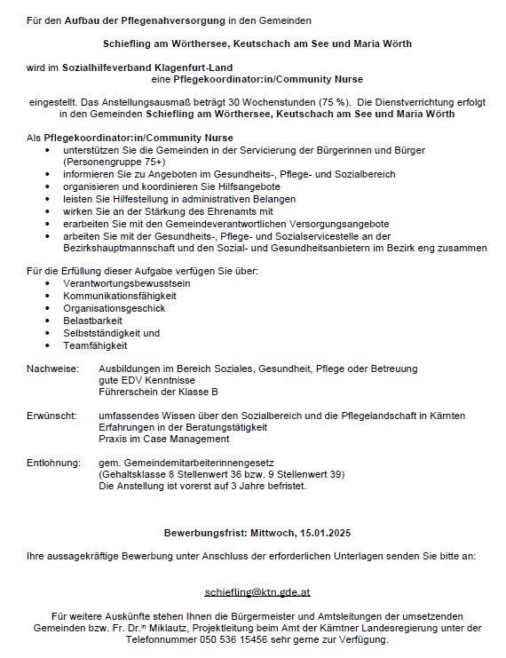 Aktuelles Stellenausschreibung Pflegekoordinator:in/Community Nurse Veröffentlicht am 12. Dezember 2024 Downloads Stellenausschreibung PDF, 127 KB SchlagwörterInformationsschreiben, Job, Stellenausschreibung Nächster Beitrag: Fischerei Schonzeitenverordnung in Kraft Vorheriger Beitrag: Konsumerhebung Statistik Austria