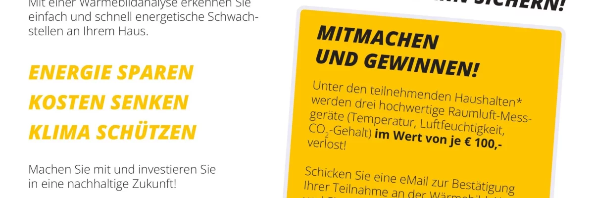 Vom 2.01.2025 bis 28.02.2025 können Einfamilienhausbesitzer an der Wärmebildaktion von „Unser Lagerhaus“ teilnnehmen: Einfach und schnell können energetische Schwachstellen erkannt werden. Alle teilnehmenden Haushalte nehmen an der Verlosung von drei hochwertigen Raumluft-Messgeräten teil, einer Aktion der KEM – Klima- und Energie-Modellregion Wörthersee Karolinger. Alle Informationen finden Sie im angefügten Flugblatt.