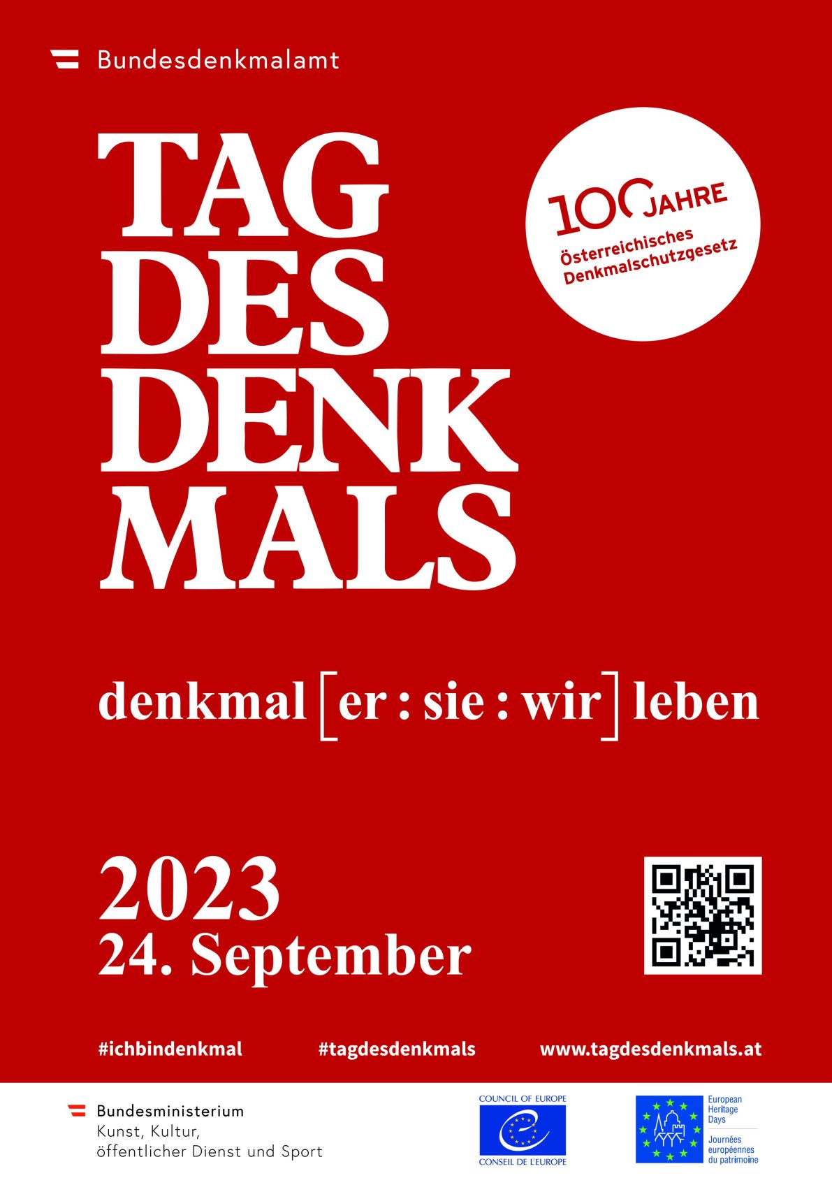 Unter dem Motto „denkmal [er:sie:wir] leben | 100 Jahre Österreichisches Denkmalschutzgesetz“ sind am 24. September 2023 österreichweit mehr als 250 historische Objekte bei freiem Eintritt zu besuchen. Der Tag des Denkmals wird vom Bundesdenkmalamt koordiniert und findet jährlich am letzten Sonntag im September in ganz Österreich statt. Das vollständige Programm finden Sie auf www.tagdesdenkmals.at.